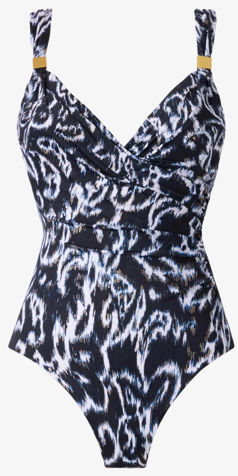 The Siren flatters with a curvaceous surplice neckline, shirred waist, and gold accents.
