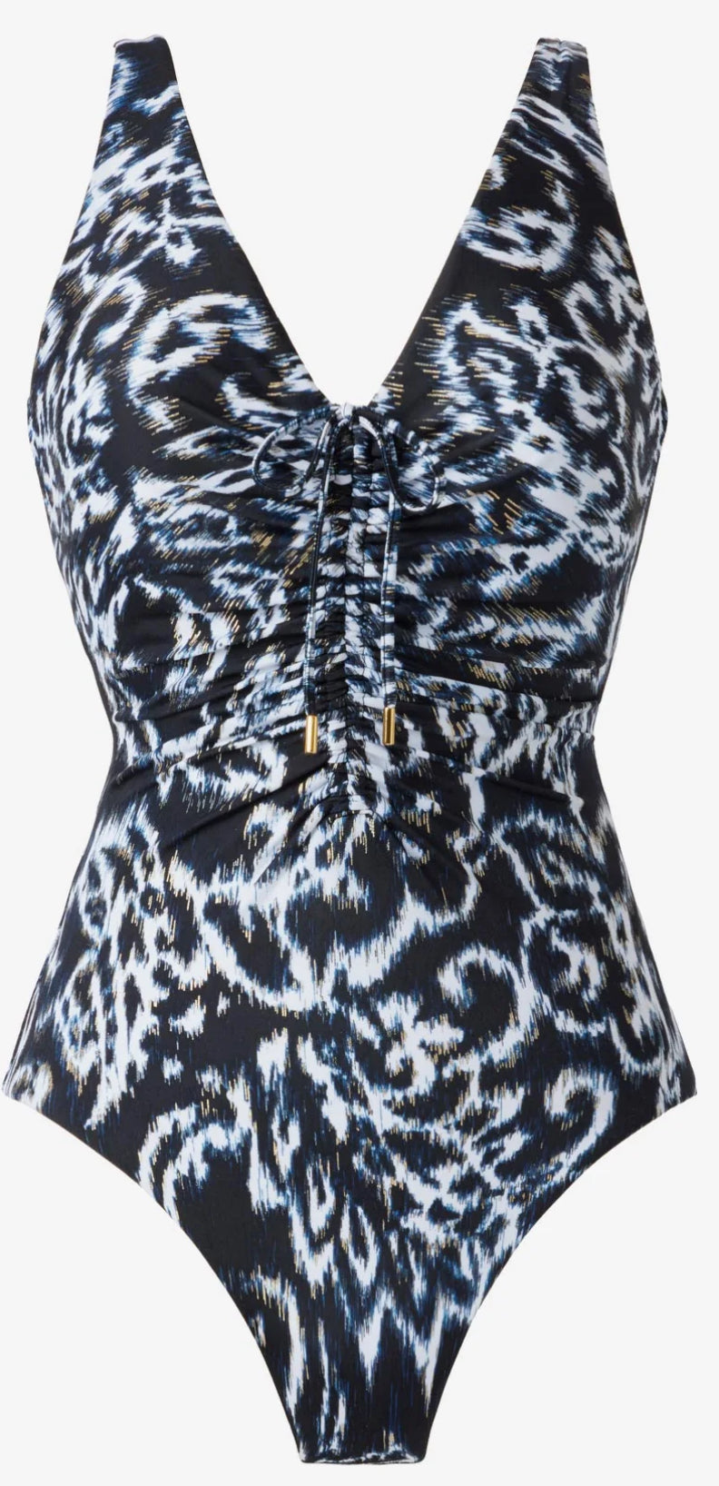 The Bella slims and sculpts with subtle shirring and hidden soft cups, drawing the eye to a unique V-neckline with functional ties that glisten with gold.