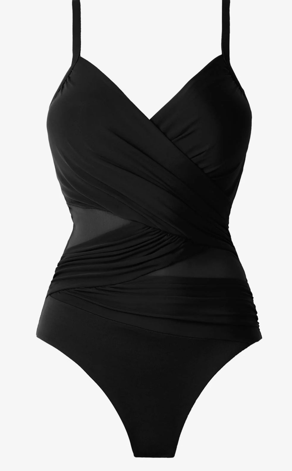 • Cleverly Draped Fabrc, Mesh Inset, Cinched Twist At Waist Creates Hourglass Effect
